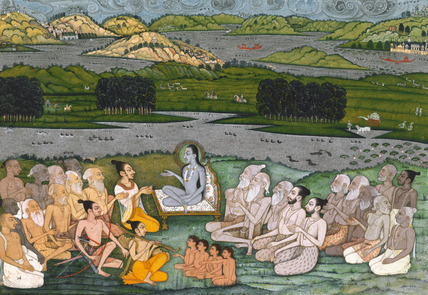 English: "Shri Sukdevji Preaching to a Concourse of Sadhus. Opaque watercolour on paper. Rajasthan, India"