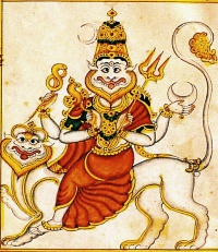 [[Datei:Pratyangira.JPG|200px|thumb|right| Pratyangira auf Vahana] | [[Datei:Pratyangira.JPG|200px|thumb|right| Pratyangira auf Vahana]] | ||
