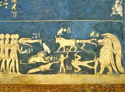 Zum Moment, wenn der Sonnengott Re den Bereich der Mesqet und die Duat verlässt, heisst es dort : So entsteht, dass er sich zum Himmel entfernt, in der „Stunde, die zufriedenstellt. So wird seine Gestalt stark und groß. Bei Nacht gehen die Bas beim Fahren am Himmel hervor. Die Dekansterne folgen Re bei seinem Aufgang in der Stunde, die zufriedenstellt. Am Tag sind sie nicht sichtbar für die Menschen.( Nutbuch, Sethos I.-Schrift:[1]