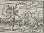 Der Mythos erzählt, dass Apollon nach der Geburt Pfeil und Bogen ergreift und über Meer und Länder eilt und mit seinen sicheren Pfeilen den Drachen Python tötet, den Sohn der Gaia und des Tartaros, wofür er allerdings bei Admetos von Pherai ein Jahr als Hirte dienen mußte.