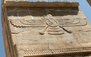 Die Agypter hatten die geflügelte Sonne als Symbol. Selbst Isis wird mit ausgebreiteten Geierschwingen abgebildet, mit denen sie den Pharao schützt, der Osiris Opfergaben bringt. Der Pharao wird auch als liegende Sphinx mit einem Salbgefäß in den Vordertatzen vor einer Gottheit dargestellt, während Behdeti als geflügelte Sonnenscheibe über ihm schwebt.