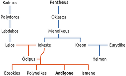 Als Antigone trotz ihrer Verlobung mit Kreon's Sohn Haemon(Greek: Αἵμων, Haimon : 'blutig') gefangen wird, der seinen Vater bezichtigt, die göttlichen Gesetze zu missachten und seine staatliche Macht zu missbrauchen, verfügt Kreon, sie lebendig zu begraben. Ismene erklärte dazu, sie habe Antigone geholfen und wollte das gleiche Schicksal, obwohl sie nicht an dem Verbrechen beteiligt war. Antigone weigert sich, sie für eine Sache zu töten, für die sie nicht eingetreten war.