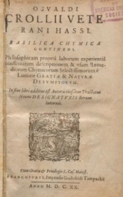 • Osvaldi Crollii ... basilica chymica : continens philosophicam propria laborum experientia confirmatam descriptionem & usum remediorum chymicorum selectissimorum e lumnine gratiae & naturae desumptorum ; in fine libri additus est autoris eiusdem tractatus novus de signaturis rerum internis, Croll, Oswald [1580-1609] Search Wikipedia for Oswald Croll, Imprint Francofurti : impensis Godefridi Tampachii, 1620