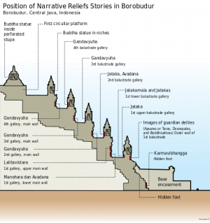 Die ersten vier Terrassenwände sind Schaukästen für Reliefskulpturen. Die mehr als 2500 Reliefs in Borobudur zeigten viele Szenen des täglichen Lebens im antiken Java des 8. Jahrhunderts. Sie beschreiben auch das Leben und das Wirken Buddhas.