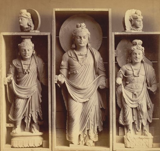Photograph of three statues of Bodhisattvas from Jamal-Garhi taken by James Craddock in the 1880s. Text accompanying these prints reads, "The plates entered here also include photographs taken from sculptures coming from Takht-i-Bahl and Shahr-i-Buhlul." Jamal-Garhi was a Buddhist monastery located in the Peshawar district of northern Pakistan. From the first until the fifth century AD, Buddhism flourished in Peshawar district which was known as Gandhara at that time. The city of Peshawar was the winter capital of a large empire and the monasteries in the area around the city attracted Buddhists from all over South Asia. The area was also home to a large number of skilled craftsmen who produced high quality items such as the sculptures of Bodhisattvas pictured here. Bodhisattvas are a type of Buddhist deity who were once mortals. They became enlightened, yet instead of ascending to Nirvana, remained on earth to help others attain the same goal. They were a prominent feature of Mahayana Buddhist doctrine. The Bodhisattvas in this photograph are sculpted in what can be broadly termed the Gandharan style. This style developed in the Peshawar region from the first century onwards and bears affinities with Graeco-Roman sculpture. In this photograph the draped clothes and naturalistic modelling of the body betray this influence. Date 16 March 2007 Source British Library Author Fowler&fowler at English Wikipedia Licensing Public domain