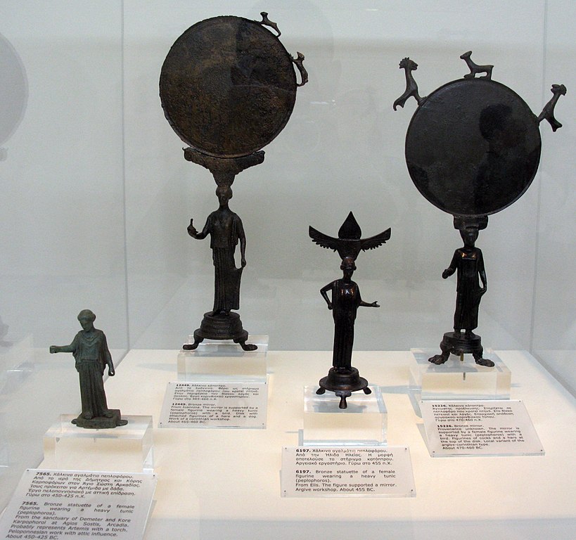 7565. Bronze statuette of a female figurine wearing a heavy tunic (peplophoros). From the sanctuary of Demeter and Kore Karpophorol at Agios Sostis, Arcadia. Probably represents Artemis with a torch. Peloponnesian work with attic influence. About 450-425 BC. National Archaeological Museum, Athens, Greece. --- 6197. Bronze statuette of a female figurine wearing a heavy tunic (peplophoros). From Elis. The figure supported a mirror. Argive workshop. About 455 BC. --- 15226. Bronze mirror. Provenance unknown. The mirror is ssupported by a demale figurine wearing a heavy tunic (peplophoros) with a bird. Figurines of cocks and a hare at the top of the disk. Local variant of the argive-corinthian type. About 470-460 BC. --- 12449. Bronze mirror. From Ioannina. The mirror is supported by a female figurine wearing a heavy tunic (peplophoros) with a bird. Disk with attached figurines of a hare and a dog. Work of a corinthian workshop. About 465-460 BC.