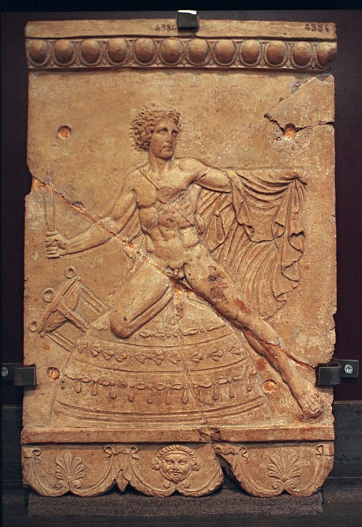 English: Orestes kneeling at the omphalos of Delphi. Terracotta after 27 BC, from Rome. Museo Nazionale Romano. Photo from the exhibition Klassik 2002 in Berlin.