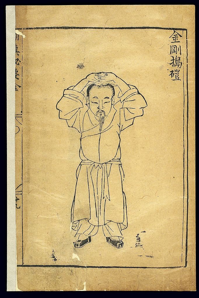 Xiuzhen miyao, a gymnastic (daoyin/qigong) text of unknown origin, was rediscovered and published with a preface by Wang Zai in 1513 (8th year of the Zhengde reign period of the Ming dynasty). It records 49 exercises. This illustration depictsJingang daoze(The Four Attendant Warriors strike blows), a technique used to treat abdominal distention, and pain throughout the body. It is practised as follows: One stands up straight with the hands raised palm upwards and the heels on the ground. Contracting the anus, one circulates Qi for nine breaths.