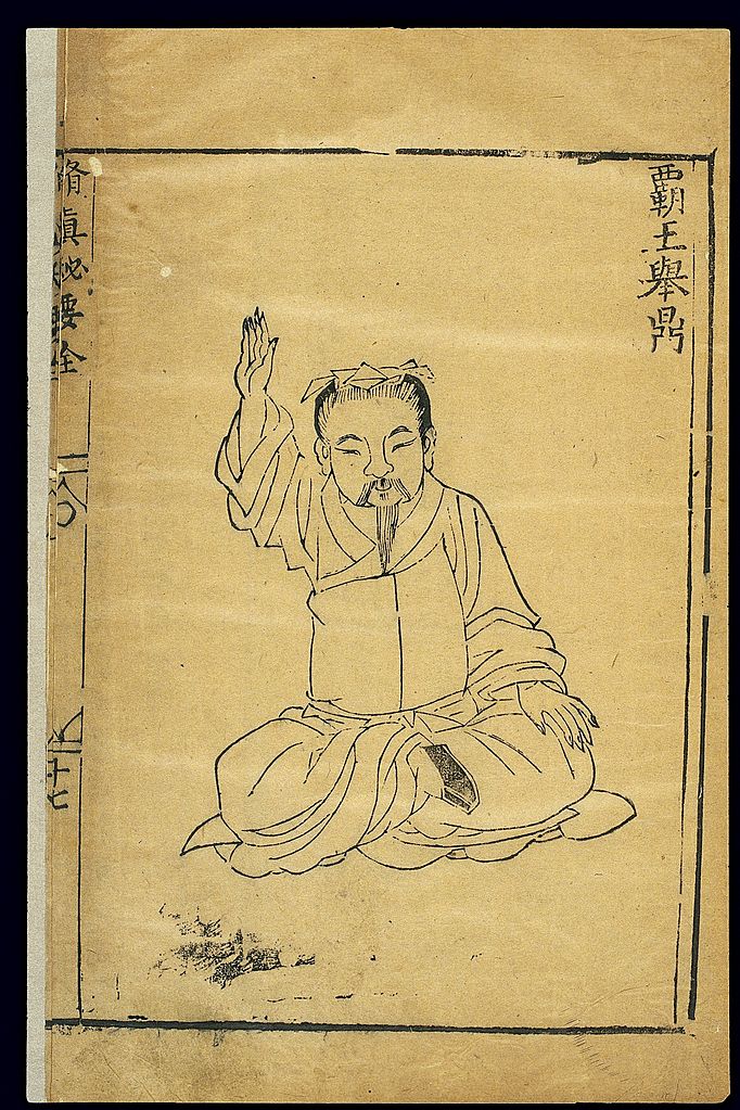 Xiuzhen miyao, a gymnastic (daoyin/qigong) text of unknown origin, was rediscovered and published with a preface by Wang Zai in 1513 (8th year of the Zhengde reign period of the Ming dynasty). It records 49 exercises. This illustration depictsBawang ju ding(the Conquering Overlord raises the ceremonial vessel), a technique used to treat miscellaneous abdominal conditions. It is practised as follows: Sitting upright, one places the left hand on the knee while raising the right arm, and circulates Qi for 12 breaths. One then circulates Qi for 12 breaths with the right hand on the knee and the left arm raised.
