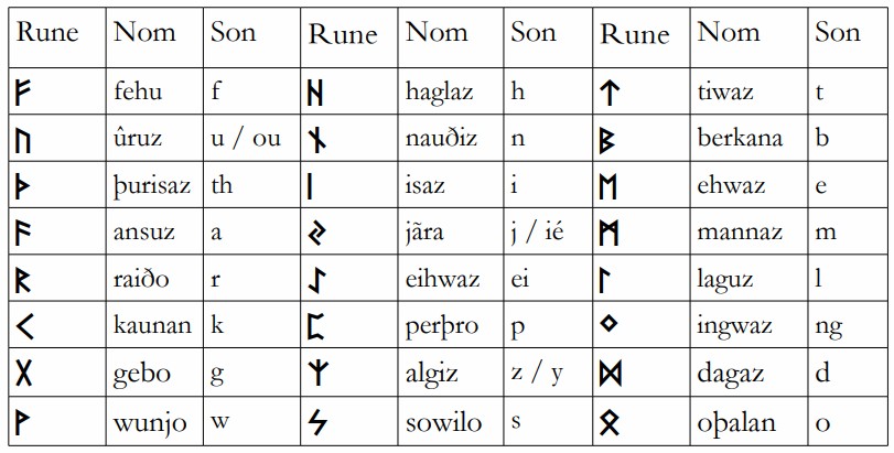Tableau der Klangkorrespondenzen der 24 Runen aus dem alten Futhark.