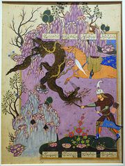 In Abū ʾl-Qāsim Firdausī's (940–1020) Shahnameh muss der iranische Held Rostam mit Hilfe seines legendären Pferdes Rakhsh einen 80 Meter langen Drachen töten, der sich für den Menschen unsichtbar macht. Der Drache nähert sich, während Rostam schläft. Rakhsh versucht Rostam zu wecken, macht ihn jedoch nicht auf die Gefahr aufmerksam, bis Rostam den Drachen sieht. Rakhsh beißt ihn, während Rostam sie enthauptet. Dies ist der dritte Prozess von Rostams Sieben Arbeiten.