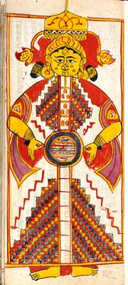 Die Jaina-Kosmologie beinhaltet den Glauben an einen kosmischen Menschen[1], der sich in einem Raumspalt befindet, in dessen Zentrum die Menschen leben.