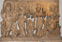- Kaumari (Ambhika, Karttikeyani): Muruga (Subramania oder Kaarthikeya) - Die gelbfarbige Göttin hat sechs Köpfe wie Kartikeya. Sie hält Parasu und Chapa in den oberen Händen und Shakti und Tanka in den unteren. Manchmal werden zwei ihrer Hände in Abhaya- und Varada - Gesten dargestellt. Der Pfau ist ihr Vahana - Bija Hoom - Gier, Verblendung