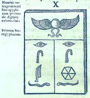 Der dritte Band beinhaltet Kirchers Versuche, die komplexen ägyptischen Hieroglyphen zu entziffern, was aber erst Champollion 1822 wirklich gelang. Die primäre Quelle für Kircher war die Mensa Isiaca, auch Tafel des Bembo genannt.[1], die Kardinal Pietro Bembo kurz nach der Plünderung Roms im Jahre 1527 erwarb.