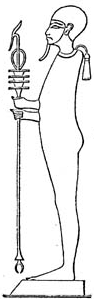 Manchmal steht Ptah auch auf einem Sockel als Symbol für Maat (Ordnung oder Weltordnung). Ab dem mittleren Reich wird er mit einem steif abstehenden geflochtenen Kinnbart dargestellt.