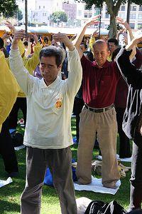 Falun Gong oder Falun Dafa (Pinyin Fǎlún gōng,Fǎlún dàfǎ : 'Dharma-Rad-Praktik','Gesetzesrad-Praktik') ist eine von Li Hongzhi verbreitete Praktik mit Bezug auf die daoistisch - buddhistische Tradition, die Meditation und Qigong-Übungen kombiniert. Die Praktik betont Moral (Wahrhaftigkeit, Barmherzigkeit und Nachsicht) und die Kultivierung der Tugend. Die entsprechende Massenbewegung wird von der KPCh seit 1999 als 'bösartige Sekte' und Kult bis ins Ausland verfolgt. Am 23. Januar 2001 setzten sich fünf Anhänger des Falungong auf dem Platz des Himmlischen Friedens (Tian’anmen) in Beijing in Brand, um gegen die Unterdrückung ihrer buddhistisch orientierten Qigong - Bewegung zu protestieren. Auch das Qigong geriet in die Kritik der kommunistischen Partei, da Religion nach der chinesischen Verfasssung innerhalb staatlich genehmigter (und kontrollierter) religiöser Organisationen und Andachtsstätten stattfinden muss.