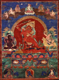 Roter Yamari flankiert von Virupa und Dombi Heruka