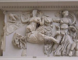 Rhea wird mit einem Löwen als Reittier dargestellt. Sowohl der Name als auch die Natur dieser Göttin sind einer der am schwierigsten zu verstehenden Punkte der griechischen Mythologie. Sie wird oft mit der anatolischen Muttergottheit Kybele (Cybele) gleichgesetzt.