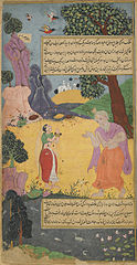 Die himmlische Schönheit und Apsara Rambha, die beim Quirlen des Milchozeans entstand, mit Shukra('Rein'(heit))