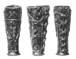 • Der Thyrsos ist auch ein Attribut von Mänade und Satyr, wobei die Mänaden ihn links und die Satyr ihn rechts tragen.