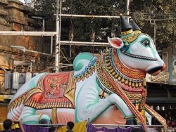 Shivas Reittier Nandi ist ein glücklicher Stier(Ananda). Als sein Vater gilt der Prajapati Kashyapa. Er führt die Ganas an und fungiert als Wächter und Schwellenhüter vor den Shiva-Lingams und den Shiva-Tempeln. Im Ramayana schützt er den Berg Kailasch vor Ravana.