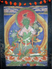 Als große grüne Göttin Arya-Tara (tib. Jetsun Dolma) oder Shyama Tara(Syamatara) hat Tara 108 Namen. Sie soll besonders vor den 8 Furchtzuständen[9] schützen[10] : om sarva vidya svaha. om tare tuttare ture svaha