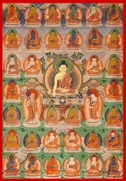 Der Text beschreibt die Praxis der Reinigung durch Bekennen und Niederwerfungen vor 35 Buddhas.