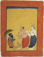 Vamana und Bali, rechts Shukra mit warnend erhobenem Finger