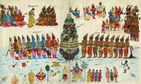 [[Datei:Sagar mathan.jpg|200px|thumb|left|Sagar mathan - die Schlange Vasuki, deren Schwanzende wird durch die Dikpalas gehalten wird ]] | |||