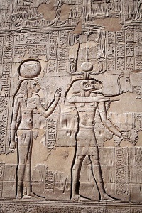 Die Göttin Khnum hat auf Abbildungen neben der Sonnenscheibe(Re) und den Tafeln über dem Kopf zwei Schlangen, die den Fluiden Jin und Jang entsprechen.[[Datei:SFEC_EGYPT_ESNA.jpg|200px|thumb|right|Khnum and Menhit]] | |||