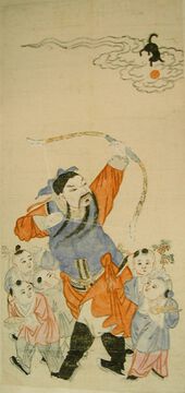 220 KB | Adm1 (Diskussion | Beiträge) | https://commons.wikimedia.org/wiki/File:Zhangxian02.jpg This painting depicts Zhang the Immortal shooting a pebble bow at a heavenly dog. Because of the painting's association with the story of Lady Flower Stamen, a concubine of the first Song Emperor Tai Zu, it is often interpreted as a metaphor for fertility. Date Late Qing dynasty (around end of 19th century) Source "The New Year Painting of Zhang Xian" Dort : This work is in the public domain in its country of origin and other cou… | 1 |