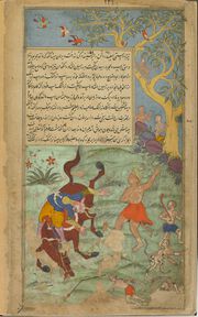 2,12 MB | Adm1 (Diskussion | Beiträge) | https://commons.wikimedia.org/wiki/File:Angada_smites_the_demon_Narantaka.jpg Fazl , (Indian, Indian) Mughal dynasty Description English: Angada smites the demon Narantaka Date between 1597 and 1605 Medium gouache, ink and gold on paper Dimensions height: 27.5 cm (10.8 in); width: 15.2 cm (5.9 in) Credit line Gift of Charles Lang Freer Notes Folio from the Ramayana of Valmiki (The Freer Ramayana), Vol. 2, folio 226 References https://asia.si.edu/object/F1907.271.173-346/ Sou… | 1 |