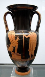 So befreite er Theben von der Sphinx und wurde zum König von Theben ernannt. Er erhielt Iokaste, d.h. seine eigene Mutter, zur Frau, mit der er die Zwillinge Eteokles('wirklich wunderschön, zu Recht berühmt') und Polyneikes('großer Sieg') und die Töchter Antigone('gegen Geburt') und Ismene(isme : 'Wissen') zeugte. Ödipus verfluchte seine Söhne anderweitig wegen ihrer Respektlosigkeit ihm gegenüber.