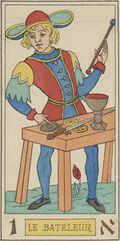 (Die erste Phase mit 'Erde und Wasser' betrifft die Läuterung der niederen Natur des Menschen, die in der Alchemie mit grauer Wolf bezeichnet wird. Daher zeigt die Tarotkarte auch die leicht erweckte Kundalini.--- Die bisherige Transformation ist aber nicht ausreichend.)