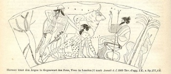 Zeus gelang es aber, mit Io in Gestalt eines Stieres zu kopulieren und so den Epaphos zu zeugen, der nach Aischylos (Der gefesselte Prometheus) eine schwarze Hautfarbe hat. Er schickte Hermes, den Argos zu töten und Io zu retten und zu entführen.