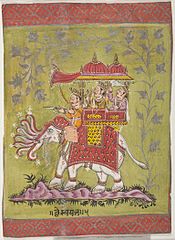 Er wird als leuchtender goldfarbener Mann mit Donnerstimme beschrieben. Sein Vahana ist ein Elefant.