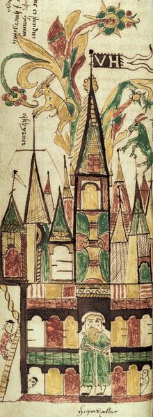 From the 17th century Icelandic manuscript AM 738 4to, now in the care of the Árni Magnússon Institute in Iceland. Other version: File:AM 738 4to, 42v, BW Valhöll.jpeg