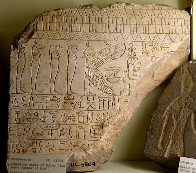 Bild von https://en.wikipedia.org/wiki/File:Fragment_of_a_limestone_stela_of_Djiho_(Djedher),_the_God%27s_Father_of_Min._Ptolemaic,_27th_Dynasty._From_Egypt._The_Petrie_Museum_of_Egyptian_Archaeology,_London.jpg