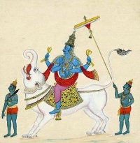 Auf manchen Abbildungen trägt er das Cintamani-Juwel auf der Stirn. Er ist in Indien auch das zehnte Tierzeichen im Zodiak.