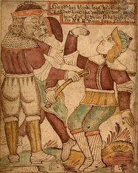 4. Nicht säumt Siegvaters erhabner Sohn Widar mit dem Leichenwolf zu fechten: Er stößt dem Hwedrungssohn (Fenrir) den Stahl ins Herz durch gähnenden Rachen: So rächt er den Vater.(Völuspa 54)