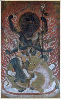 Yamantaka Vajrabhairava wird büffelköpfig mit einem Ochsen als Reittier dargestellt. Sein Büffelkopf ist allerdings von Licht durchdrungen.